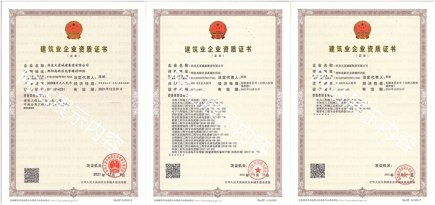 浩龍?zhí)煨浅墙瘓F(tuán)有限公司,2007年成立于“李白故鄉(xiāng)、中國(guó)科技城”—四川省綿陽(yáng)市,企業(yè)注冊(cè)資本金5.0008億元。公司共有27項(xiàng)建筑業(yè)企業(yè)資質(zhì),其中國(guó)家一級(jí)資質(zhì)11項(xiàng),二級(jí)資質(zhì)10項(xiàng),三級(jí)資質(zhì)5項(xiàng),特種資質(zhì)不分等級(jí)1項(xiàng),類別涵蓋建筑、市政、水利、機(jī)電、隧道、起重設(shè)備安裝等基礎(chǔ)及未來(lái)發(fā)展重點(diǎn)專業(yè)。公司...